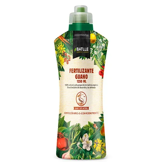 El Fertilizante Guano Ecológico BATLLE 1250 ml es un complejo nutritivo de origen natural, obtenido de la descomposición de los excrementos de aves marinas que se han alimentado de algas. Su formulación lo convierte en un producto pensado para promover un crecimiento, desarrollo y oración equilibrados, al mismo tiempo que estimula las defensas naturales de las plantas para crecer más fuertes y sanas. Tiene un efecto doble acción que combina la mejora de la calidad del suelo con la acción fertilizante para las plantas. Recomendado para todo tipo de plantas y condiciones (interior, terraza y jardín).